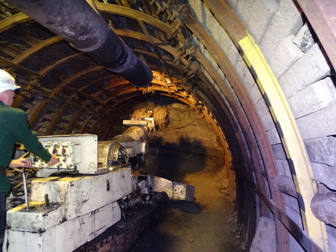 Część trasy na poziomie 320 m pokonaliśmy elektryczną kolejką podwieszaną. Jest to jedyna tego typu kolejka górnicza na świecie udostępniona dla turystów! Zawiozła nas w rejon pracy dwóch kombajnów górniczych, chodnikowego i ścianowego. Tam z bliska zobaczyliśmy, jak pracują te potężne maszyny do urabiania skał i węgla.